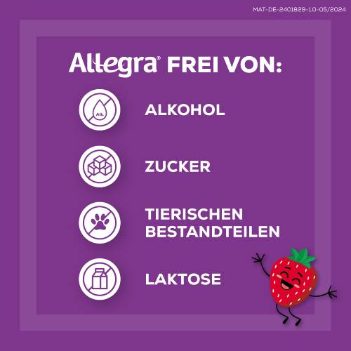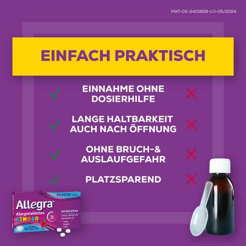 - KINDERLEICHTE EINNAHME: Allegra® Schmelztabletten für Kinder zergehen auf der Zunge und können ohne Wasser eingenommen werden. Sie kontrollieren Allergiesymptome für 24 Stunden bei nur 1x täglicher Einnahme.