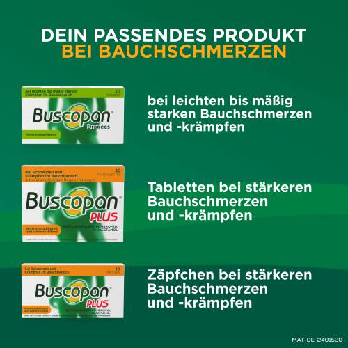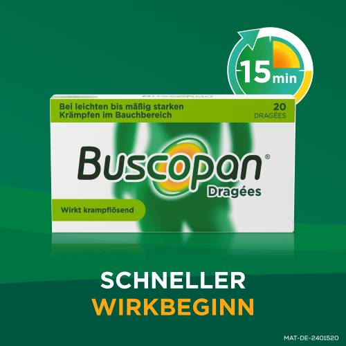 Buscopan® Dragées. Wirkstoff: Butylscopolaminiumbromid. Anwendungsgebiet: Zur Behandlung von leichten bis mäßig starken Krämpfen des Magen-Darm-Traktes, sowie zur Behandlung krampfartiger Bauchschmerzen beim Reizdarmsyndrom. Hinweis: Enthält Sucrose (Zucker). Packungsbeilage beachten. Apothekenpflichtig.