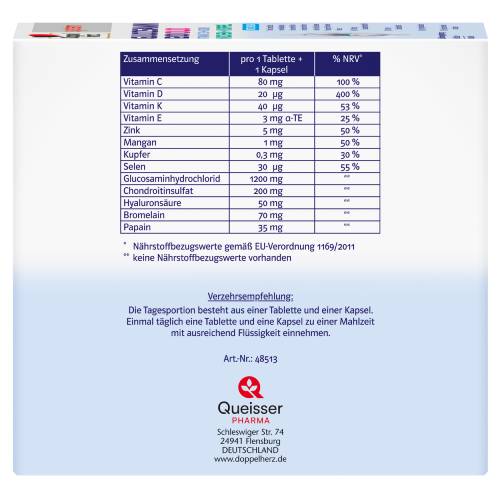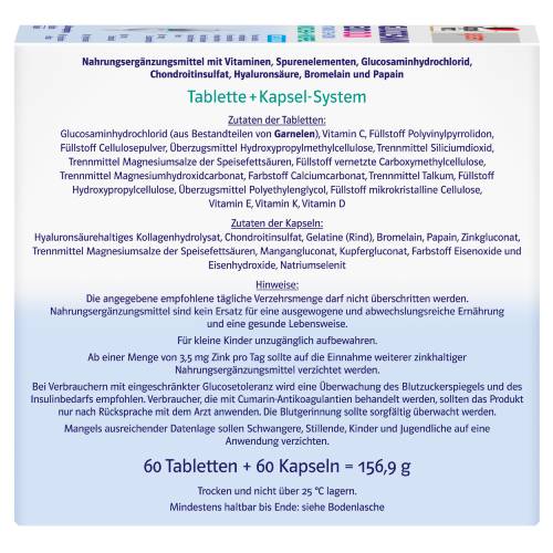 Zusätzlich sind 1200 mg Glucosaminhydrochlorid, 200 mg Chondroitinsulfat, 50 mg Hyaluronsäure sowie die Enzyme Bromelain und Papain enthalten.