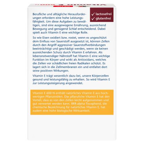 Vitamin E 600 N, Weichkapseln. Für Erwachsene. Wirkstoff: RRR-alpha-Tocopherol. Anwendungsgebiet: Zur Leistungssteigerung. Warnhinweise: Enthält Sojaöl und Sorbitol.