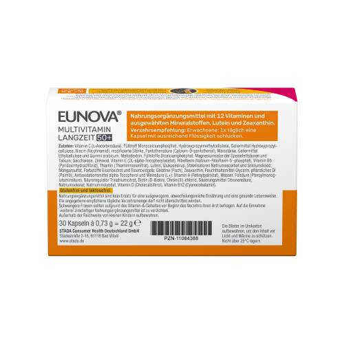 EUNOVA® Langzeit 50+ ist speziell auf den Nährstoffbedarf von Menschen ab 50 Jahren abgestimmt und enthält 12 Vitamine, wertvolle Mineralstoffe, Lutein und Zeaxanthin, die zu den Carotinoiden gehören, in einem ausgewogenen Verhältnis. EUNOVA® Langzeit 50+ verfügt neben der Nährstoffperlen-Technologie auch über ein Plus an pflanzlichen Antioxidantien. Die einzigartige Langzeit-Technologie verbessert die Aufnahme von Nährstoffen durch eine spezielle Kombination von schnell und langsam freigesetzten Perlen. Fast alle wasserlöslichen Vitamine werden über mehrere Stunden nach und nach freigesetzt. Lediglich bei Vitamin B12 und Folsäure wurde bewusst auf eine zeitverzögerte Freisetzung verzichtet, um eine optimale Aufnahme zu gewährleisten.