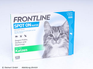Nach dem Auftragen verteilt sich das Produkt von der Auftragsstelle aus mit dem natürlichen Talgfilm der Haut und wirkt so wie ein äußerer, unsichtbarer Schutzmantel gegen Zecken, Flöhe und Haarlinge bei Katzen. Für eine optimale Verteilung sollte Ihre Katze 48 Stunden vor und nach der Behandlung nicht gebadet werden. Parasiten nehmen den Wirkstoff dann bereits bei Kontakt mit Fell und Haut auf und werden so unschädlich gemacht. FRONTLINE® SPOT ON kann bereits bei Katzen ab einem Alter von 12 Wochen und auch bei tragenden oder säugenden Kätzinnen angewendet werden.