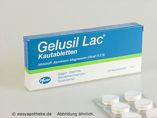 Die Gelusil Lac Kautabletten werden zur Behandlung von säurebedingten Erkrankungen wie zum Beispiel Sodbrennen angewendet. Die Kautabletten enthalten den Wirkstoff Almasilat. Dieser Wirkstoff ist in der Lage die Konzentration der Magensäure zu verringern. Das Almasilat kann schädliche Gallensäuren binden, welche sonst aus dem Darm in den Magen gelangen könnte. Bei diesem Wirkstoff Amasilat handelt es sich um ein Aluminium-Magnesium-Silikat und gehört zur Wirkstoffgruppe der säurebindenden Mittel. Die Gelusil Lac Kautabletten lindern Sodbrennen, saures Aufstoßen und Magenschmerzen und beschleunigen die Heilung von Magen- und Zwölffingerdarmgeschwüren.