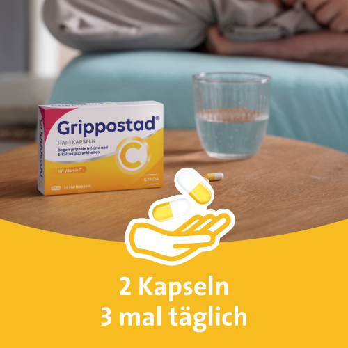 Grippostad® C Kapseln können immer dann helfen, wenn bei einer Erkältung die Erkältungsbeschwerden Kopf- und Gliederschmerzen, Schnupfen, Fieber und Reizhusten gemeinsam auftreten.