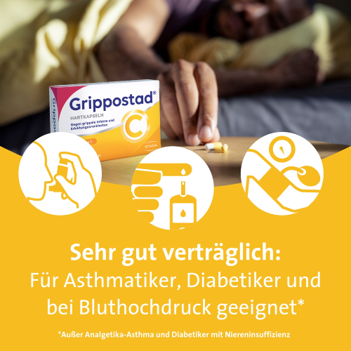 - Grippostad® C Kapseln sind auch für Asthmatiker geeignet. Einzige Ausnahme ist ein Asthma, das durch Arzneimittel (vor allem Schmerzmittel) ausgelöst ist. - Diabetiker und Patienten mit Bluthochdruck können das Medikament ebenfalls einnehmen, sofern sie eine gesunde Nierenfunktion haben. - Grippostad® C Kapseln sind für ihre rasche Wirkung und gute Verträglichkeit bekannt. Immerhin würden 95,3% der Patienten sie wieder verwenden.** - Wenn Sie schwanger sind oder stillen, dürfen Sie Grippostad C nicht einnehmen.
