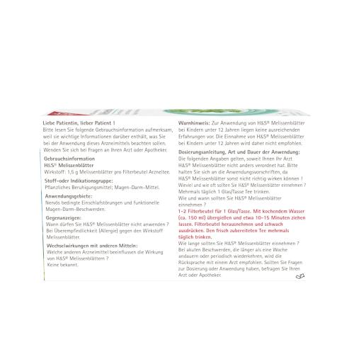 Der H&S Melissentee wird zur natürlichen Behandlung von Störungen des zentralen Nervensystems angewendet. Der Tee besteht aus Melissenblättern mit einem hohen Anteil an Terpen und Flavonoiden. Terpen verfügt über entspannende und blähungslindernde Eigenschaften. Die Flavonoide helfen gegen Herpes und können die Regulierung der Schilddrüse unterstützen. Durch einen regelmäßigen Genuss des Tees kann es zu einer Besserung des Gedächtnisses kommen. Der H & S Melissentee ist in der Lage bei Schlafstörungen, Nervenschmerzen und Störungen des Verdauungstraktes helfen.