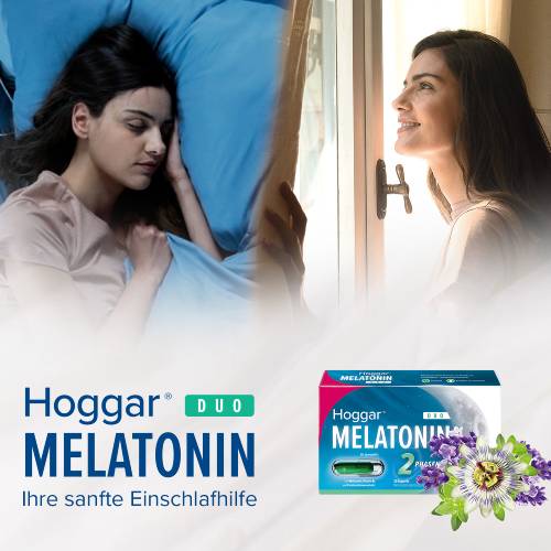 · Entspannter einschlafen, erholter aufwachen mit der innovativen Hoggar® Melatonin DUO 2-Phasen-Einschlaf-Kapsel*