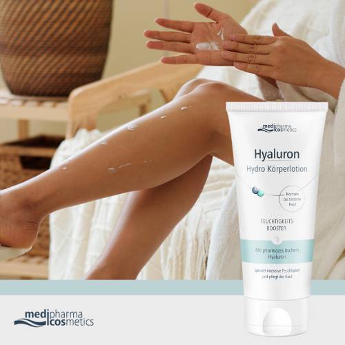 Die Hyaluron Hydro Körperlotion von medipharma cosmetics ist eine feuchtigkeitsspendende Pflegelösung für normale bis trockene Haut mit Wasser-Creme-Effekt, die mit pharmazeutischer Hyaluronsäure den natürlichen Wasserspeicher der Haut auffüllt.