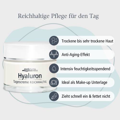 Hyaluron Tagescremee REICHHALTIG von medipharma cosmetics ist eine intensiv pflegende Gesichtscreme für trockene und empfindliche Haut mit nachhaltigem Anti-Aging-Effekt.
