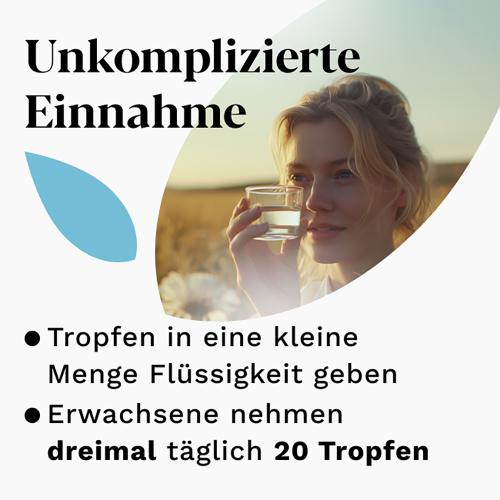 Die Einnahme der Tropfen erfolgt ganz einfach dreimal täglich zusammen mit etwas Flüssigkeit – entweder vor oder zu den Mahlzeiten. Zuvor sollten Sie die Flasche gut schütteln.