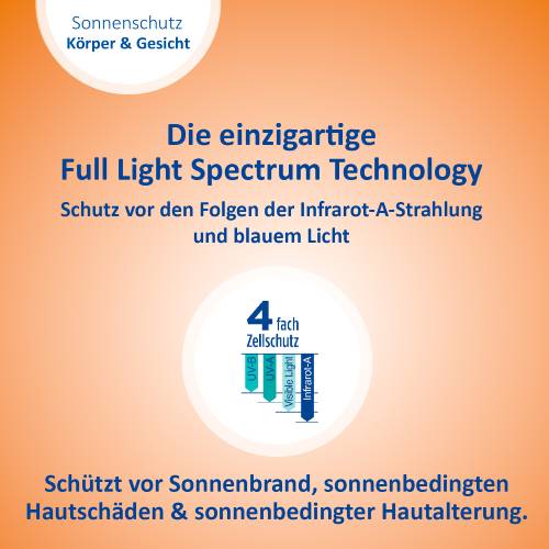 Sonnenstrahlen gibt es in verschiedenen Wellenlängen. Sie haben verschiedene Auswirkungen auf die Haut, wirken jedoch alle zellschädigend. Daher ist es wichtig einen Sonnenschutz zu verwenden, der rundum schützt. Dank einzigartigem 4-fach Zellschutz schützt die Ladival® Empfindliche Kinderhaut Sonnenschutz-Milch vor UV-A- und UV-B-Strahlen, vor den Folgen der Infrarot-A-Strahlung und sichtbarem Licht (einschließlich blauem Licht).
