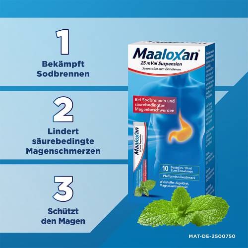 Maaloxan® 25 mVal Suspension. Wirkstoffe: Algeldrat, Magnesiumhydroxid. Anw.-geb.: Zur symptomat. Behandl. von Erkrankungen, bei denen die Magensäure gebunden werden soll: Sodbrennen und säurebedingte Magenbeschwerden, Magen- oder Zwölffingerdarmgeschwüre (Ulcus ventriculi und Ulcus duodeni). Hinweise: Nicht bei Kindern unter 12 Jahren anwenden. Beschwerden, die länger als 2 Wochen bestehen, klinisch abklären lassen. Enthält Sorbitol, Pfefferminzöl, Methyl-4-hydroxybenzoat und Propyl-4-hydroxybenzoat (Parabene). Die Einnahme anderer Arzneimittel sollte grundsätzlich mindestens 2 h vor oder nach Einnahme von Maaloxan Suspension erfolgen. Apothekenpflichtig.