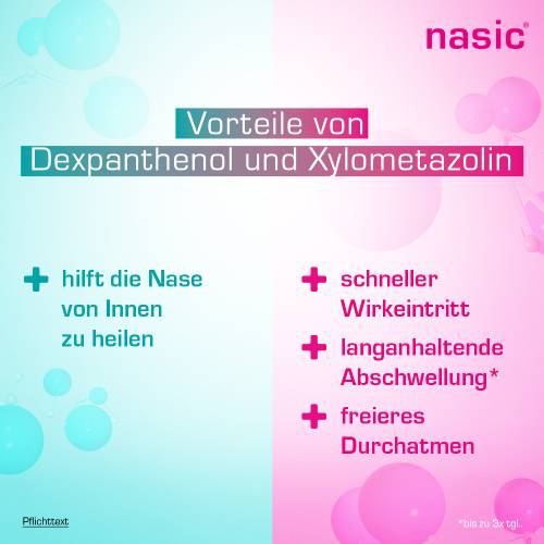 Bei einem Schnupfen ist die erschwerte Nasenatmung nicht das Einzige, das uns quält: häufig ist die Nase auch wund, gereizt und schmerzt. nasic® Nasenspray bekämpft die Schnupfen-Symptome mit der Wirkstoffkombination aus Xylometazolin und Dexpanthenol. Es lässt die Nasenschleimhaut abschwellen, sodass Sie wieder freier durch die Nase atmen können. Gleichzeitig pflegt es die Nase und fördert die Heilung der Schleimhäute.