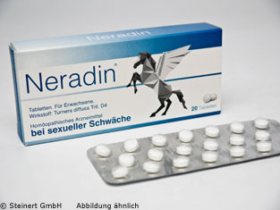Neradin® Tabletten ist ein rezeptfreies, zugelassenes Arzneimittel bei sexueller Schwäche wie z.B. Erektionsstörungen. In Neradin® ist ein aktiver Wirkstoff enthalten, der sich zusätzlich zu seiner guten Verträglichkeit durch die geprüfte und bestätigte Wirksamkeit auszeichnet. Bei Neradin® sind keine Nebenwirkungen sowie Wechselwirkungen mit anderen Arzneimitteln bekannt.