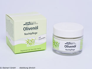 Die Olivenöl Nachtpflege Creme wird zur Pflege der Haut während des Schlafens angewendet. Die Creme enthält eine Kombination aus kaltgepressten Olivenöl und hautpflegenden Ceramiden. Durch diese Kombination wird die Haut während der nächtlichen Aufbauphase gestrafft. Zusätzlich enthaltene Vitamine und Jojobaöl sorgen für eine bessere Spannkraft der Haut und schützen sie zuverlässig vor dem Austrocknen. Durch eine Anwendung der Olivenöl Nachtpflege Creme über Nacht fühlt sich die Haut morgens zart an und sieht glatter aus.