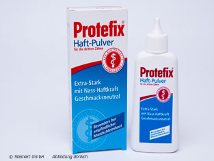Ein Klassiker unter den Haftmitteln ist Protefix Haft-Pulver: ideal bei weniger gravierenden Haftproblemen und dünnflüssigem Speichel. Die Anwendung ist ganz einfach. Protefix Haft-Pulver wird auf die feuchte Prothese gestreut und entwickelt sofort nach dem Einsetzen eine sichere, lang anhaltende Haftleistung.