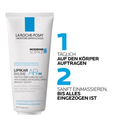 Die La Roche Posay LIPIKAR Baume AP+M Bodylotion für juckende, trockene und zu Neurodermitis neigende Haut einmal am Tag nach der Reinigung auf den Körper auftragen und sanft in die Haut einmassieren. Die rückfettende Feuchtigkeitspflege zieht schnell in die Haut ein und mildert sofort die Anzeichen von Juckreiz, Trockenheit sowie Spannungsgefühlen. Eine zusätzliche Feuchtigkeitspflege für trockene, zu Neurodermitis oder Allergien neigende Haut sind die rückfettende LIPIKAR Syndet AP+ Duschcreme, das LIPIKAR Dusch- und Badeöl AP+, der LIPIKAR Stick AP+ für unterwegs und die LIPIKAR Eczema Med Hautpflege.