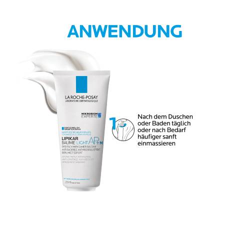 Die La Roche Posay LIPIKAR Baume Light AP+M Bodylotion bei juckende, trockener und zu Neurodermitis neigender Haut einmal am Tag nach der Reinigung auf den Körper auftragen. Anschließend sanft in die Haut einmassieren. Die schnell einziehende Feuchtigkeitspflege zieht in weniger als einer Minute in die Haut ein und mildert die Anzeichen von Juckreiz, Trockenheit sowie Spannungsgefühle der Haut. Eine zusätzliche Pflege für trockene, zu Neurodermitis oder Allergien neigende Haut sind die rückfettende LIPIKAR Syndet AP+ Duschcreme, das LIPIKAR Dusch- und Badeöl AP+, der LIPIKAR Stick AP+ für unterwegs und die LIPIKAR Eczema Med Hautpflege.