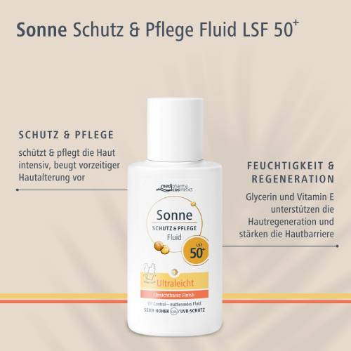 Das Sonne Schutz&Pflege Fluid mit LSF 30 von medipharma cosmetics schützt täglich vor Sonnenschäden und vorzeitiger Hautalterung. Mit seiner leichten Textur, schnellen Absorption und den pflegenden Inhaltsstoffen bietet es einen komfortablen und zuverlässigen Schutz für jede Gelegenheit. Genießen Sie die Sonne mit dem sicheren Gefühl, dass Ihre Haut optimal geschützt und gepflegt wird.