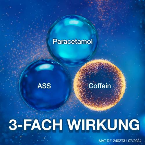 Wirkstoffe: Acetylsalicylsäure, Paracetamol und Coffein. Für Erwachsene und Jugendliche ab 12 Jahren bei akuten leichten bis mäßig starken Schmerzen. Warnhinweis: Bei Schmerzen oder Fieber ohne ärztlichen Rat nicht länger anwenden als in der Packungsbeilage vorgegeben!